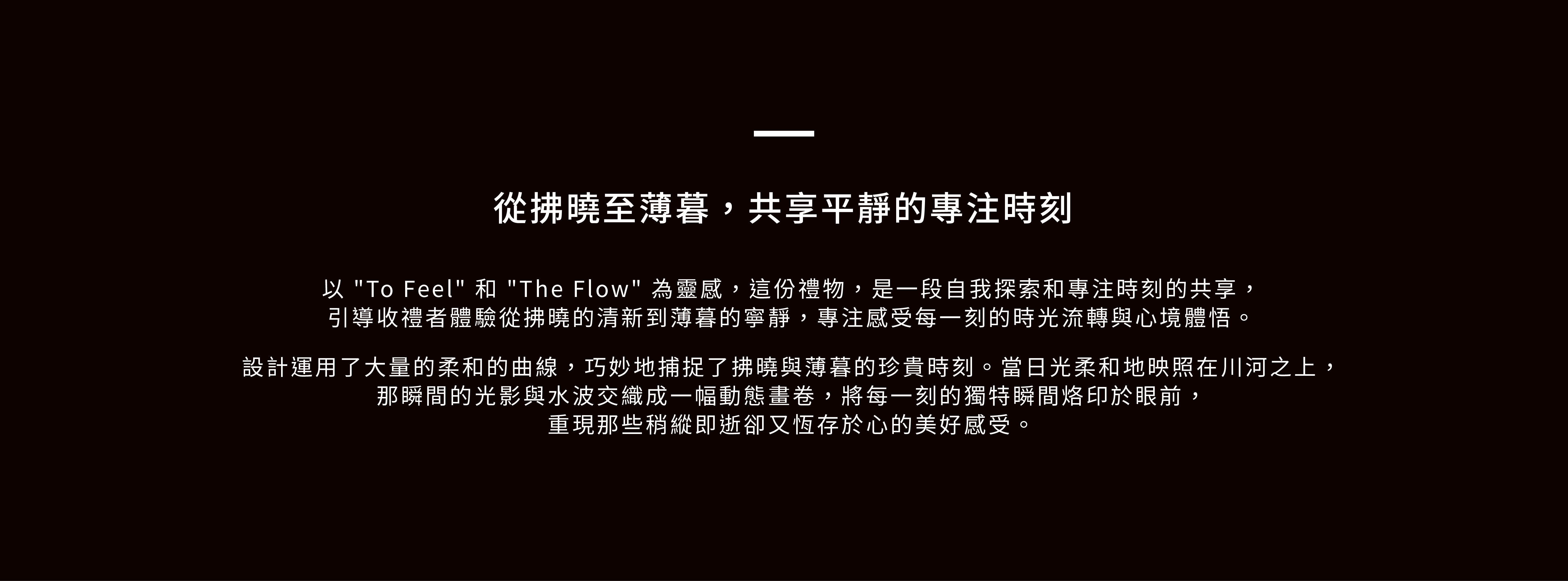 專注於生命的每一刻,陷入心流的深邃境界,時光仿佛化作河川中細膩的水滴,靜謐而迅捷地流淌。"The Flow"正是這樣一個心流時刻的縮影,從日落到夜幕的全然投入,細膩感受生活每處細節的呼喚。