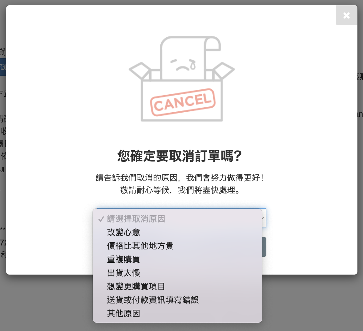 選擇「取消原因」或填寫「其他原因」。