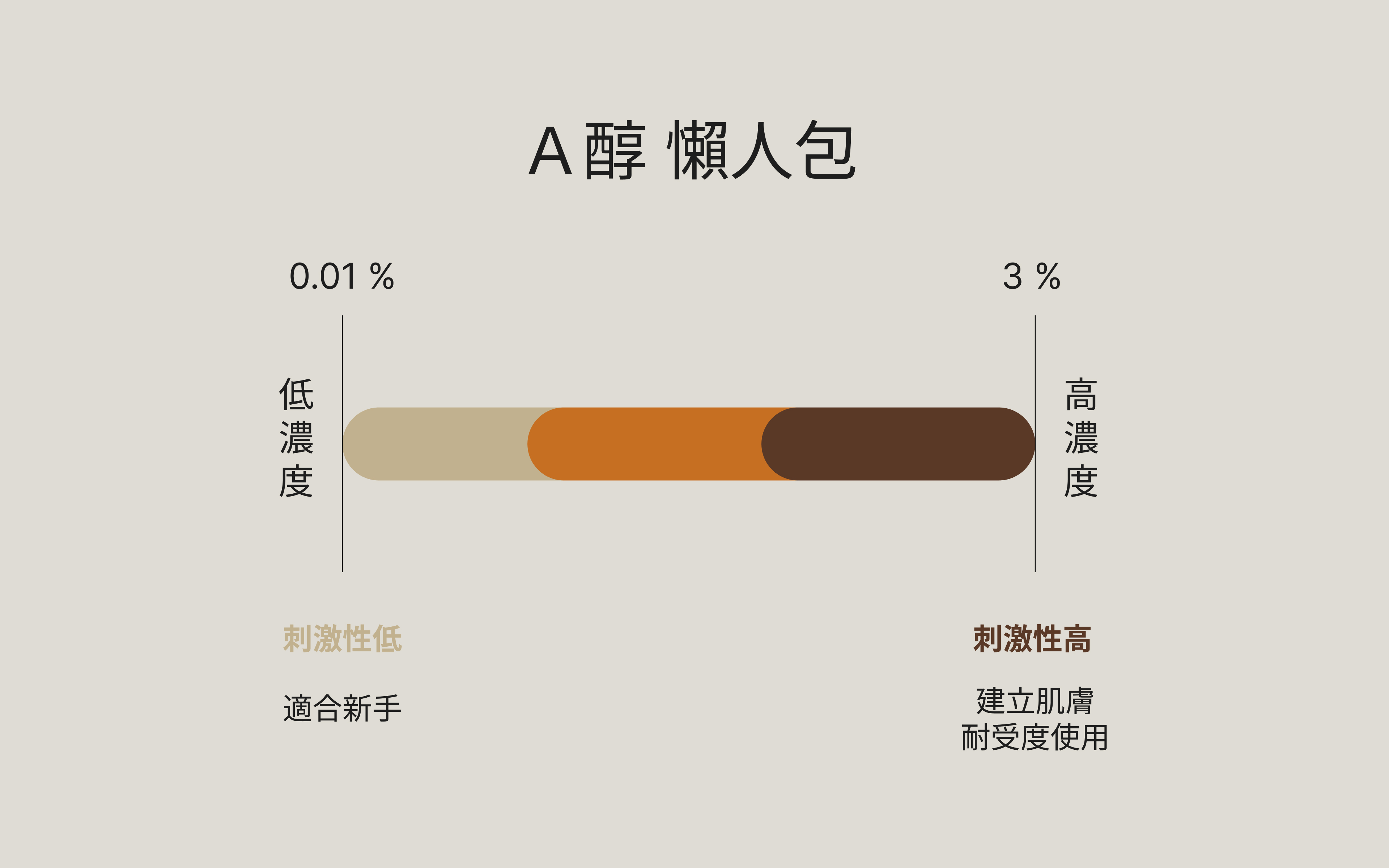 A醇濃度通常介於0.01%~3%,其中濃度越高效果也越明顯,同時對肌膚的刺激也越大。