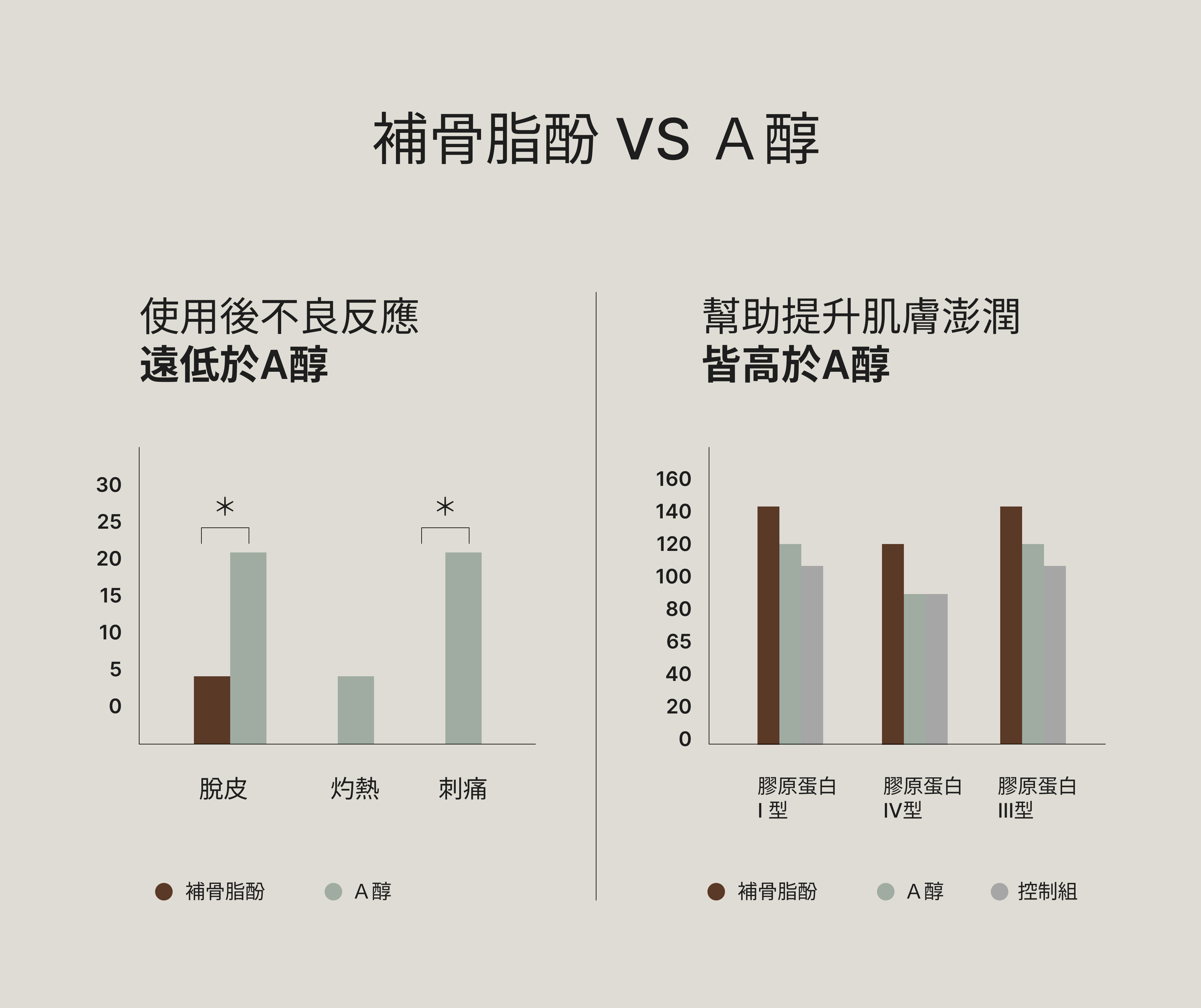 雖然A醇被實驗證實能抗老,但其副作用也不少,專家在研究此問題時發現了補骨脂酚這個新興成分,研究顯示其對於膠原蛋白和角質代謝的作用跟A醇相同,甚至更勝於A醇,卻相對溫和許多,不用忍受A醇副作用就能擁有緊緻肌膚的功效。